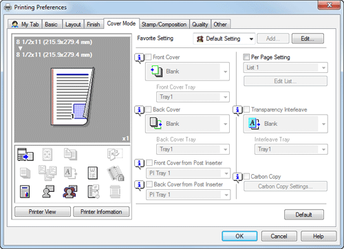 [Back Cover from Post Inserter] | In ineo+ 554e environment: Select this check box to insert and print on an outer back cover. In addition, select the PI tray for the outer back cover. You can set this option when you have selected anything other than [Auto] in [Paper Tray] in the [Basic] tab. |