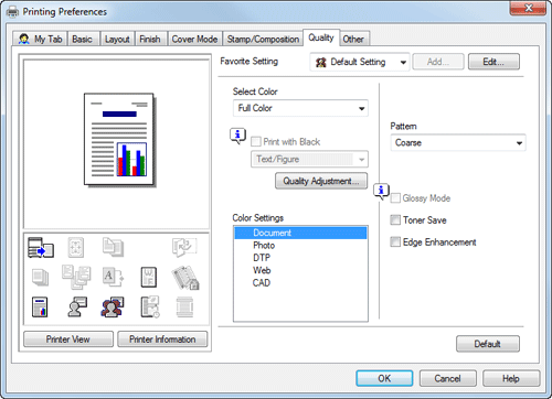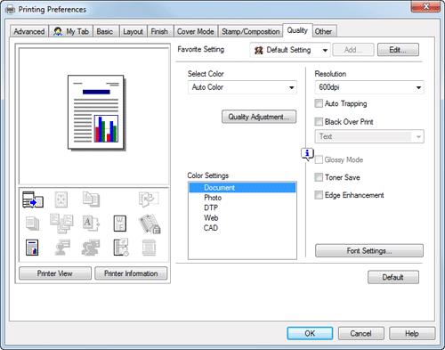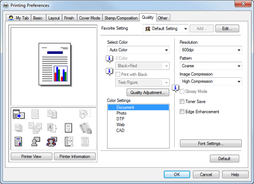 In the [Quality] tab, you can configure settings for the image quality of the original. You can specify colors, image processing, and font processing.