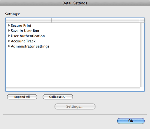 Clicking [Detail Settings...] displays the [Output Method] functions for which detail settings can be specified. Selecting a function and clicking [Settings...] displays the window for specifying the detail settings for the selected function.