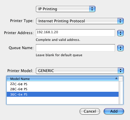 In [Address:], enter the IP address for the machine. In [Queue:], enter "ipp".