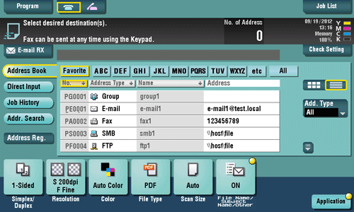The history shows the latest five fax destinations. When necessary, multiple destinations can be selected from the history.
