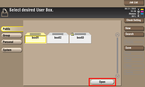 This example uses the Public User Box for explanatory purposes. To use a Personal User Box or a Group User Box, tap [Personal] or [Group] and select the desired box.