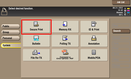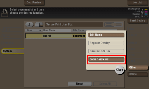 If the [Prohibited Functions When Authentication Error] is set to [Mode 2], you need to enter the password to select a file from the Secure Print User Box. You need to enter a password for each file even if secure documents have the same document ID. Therefore, the security level is higher than that of default [Mode 1]. For details on [Prohibited Functions When Authentication Error], refer to Here.