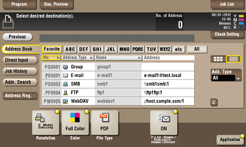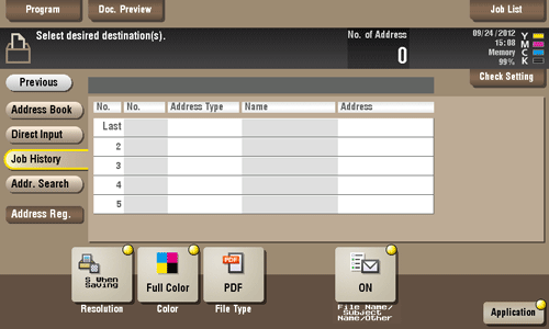 Tap [Job History], and you can select a destination from the scan or saved job history.