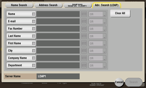 Tap [Addr. Search] - [Search] - [Address Search (LDAP)] or [Adv. Search (LDAP)].