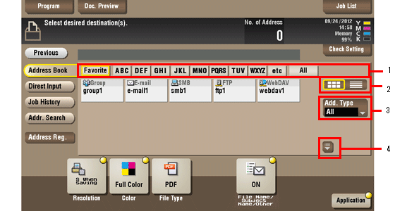 1 | Narrow down destinations using the search text specified for the registered destination. Using [Add. Type] in combination further narrows down destinations.