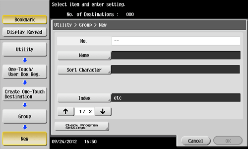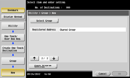 Tap [Utility] - [One-Touch/User Box Registration] - [Create One-Touch Destination] - [Group] - [New].