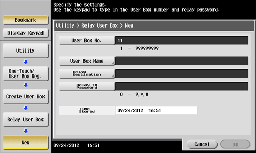 Tap [Utility] - [One-Touch/User Box Registration] - [Create User Box] - [Relay User Box] - [New].