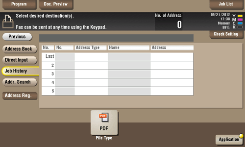 Tap [Job History], and you can select a destination from the scan or saved job history.