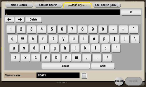 Tap [Addr. Search] - [Search] - [Address Search (LDAP)] or [Adv. Search (LDAP)].