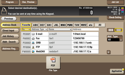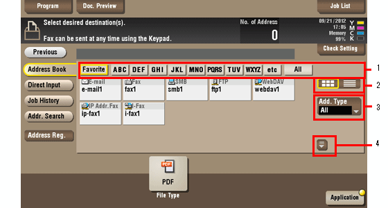 2 | Displays the registered destinations either as buttons or in a list. If switched to the list display, you can sort the destinations by registration numbers, destination types, or in alphabetical order of destination names. |