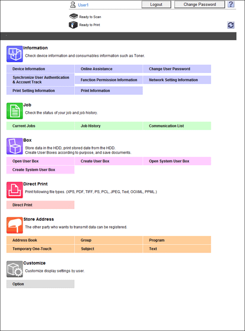 Displaying the Main Menu enables you to display the menus available in Web Connection on a single screen.