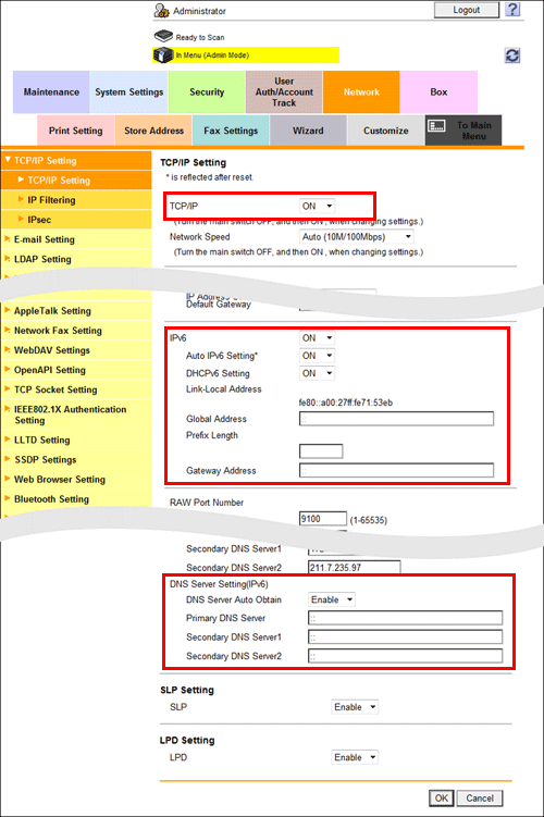 In the administrator mode, select [Network] - [TCP/IP Setting] - [TCP/IP Setting], then configure the following settings.