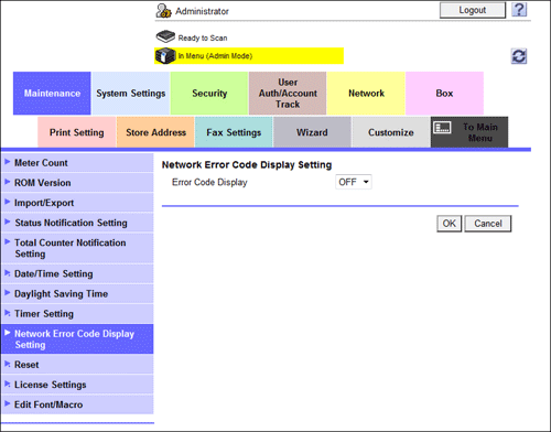 In the administrator mode, select [Maintenance] - [Network Error Code Display Setting], and set [Error Code Display] to [ON] (Default: [OFF]).