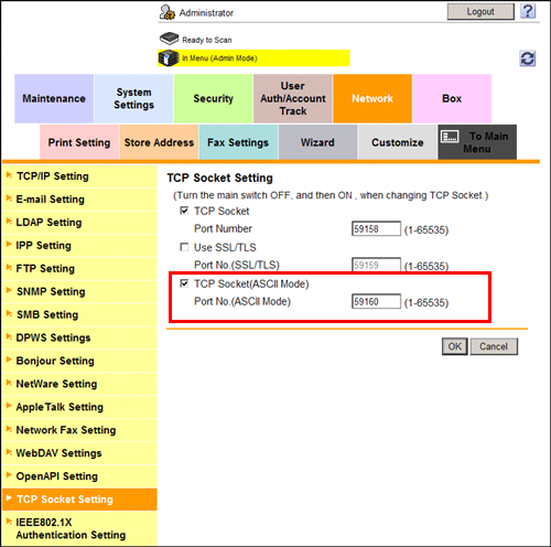 In the administrator mode, select [Network] - [TCP Socket Setting], then configure the following settings.