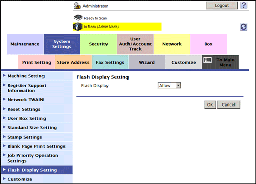 In the administrator mode, select [System Settings] - [Flash Display Setting], and set [Flash Display] to [Restrict] (Default: [Allow]).