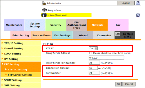 In the administrator mode, select [Network] - [FTP Setting] - [FTP TX Setting], then configure the following settings.