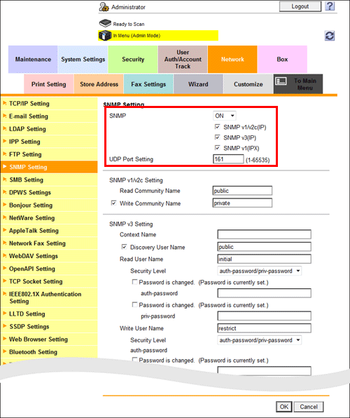 In the administrator mode, select [Network] - [SNMP Setting], then configure the following settings.