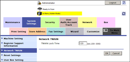 In the administrator mode, select [System Settings] - [Network TWAIN], and change the value of [TWAIN Lock Time] (Default: [120] sec.).