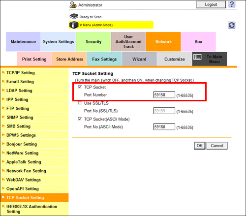 In the administrator mode, select [Network] - [TCP Socket Setting], then configure the following settings.