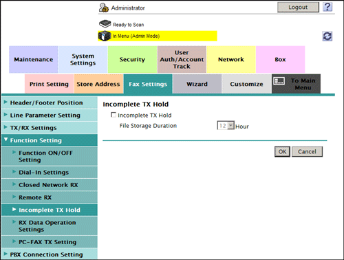 In the administrator mode, select [Fax Settings] - [Function Setting] - [Incomplete TX Hold], then configure the following settings.