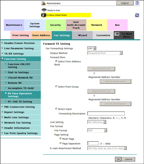 When multiple lines are used, you can select [Fax Settings] - [TX/RX Settings] - [Individual Receiving Line Setup] in the administrator mode to enable the Forward TX function for each line.