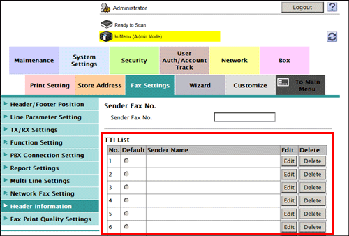 In the administrator mode, select [Fax Settings] - [Header Information], then configure the