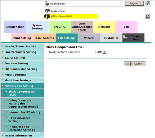 In the administrator mode, select [Fax Settings] - [Network Fax Setting] - [Black Compression Level], then configure the following settings.