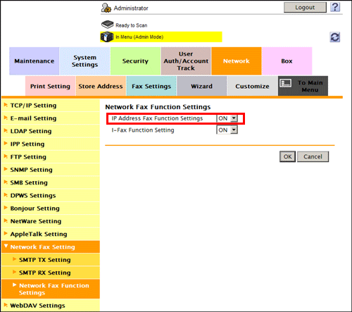 Settings], and then set [IP Address Fax Function Settings] to [ON] (Default: [OFF]).