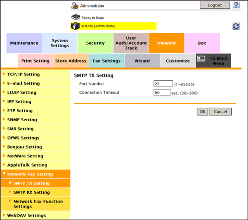 In the administrator mode, select [Network] - [Network Fax Setting] - [SMTP TX Setting], then