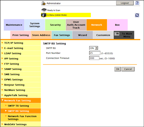 In the administrator mode, select [Network] - [Network Fax Setting] - [SMTP RX Setting], then