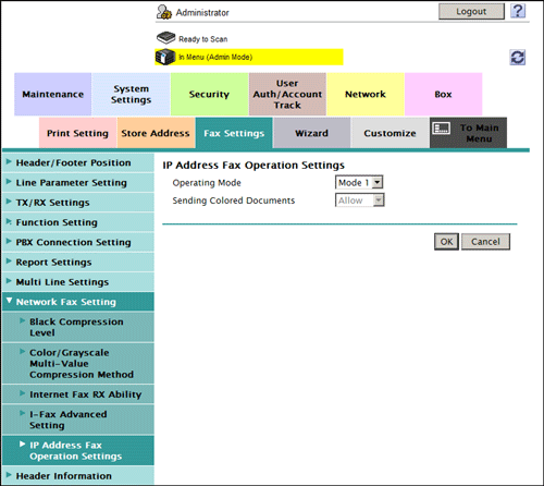 In the administrator mode, select [Fax Settings] - [Network Fax Setting] - [IP Address Fax