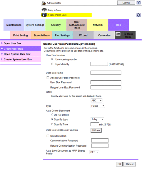 In the administrator mode, select [Box] - [Create User Box], then configure the following settings.