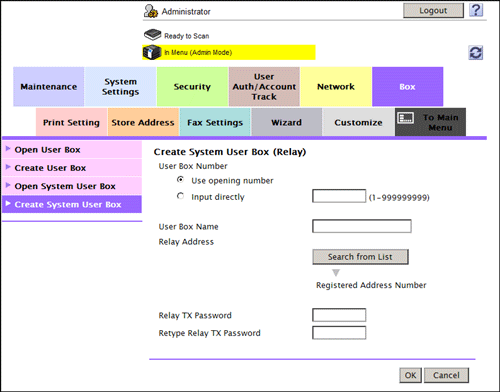 In the administrator mode, select [Box] - [Create System User Box] - [Relay User Box], then configure the following settings.