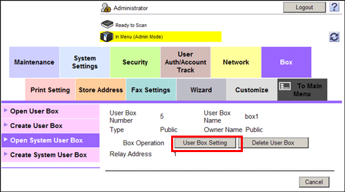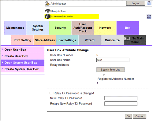 If you log in to the administrator mode, you can change settings for a registered Relay User Box or delete it without entering the password for the Relay User Box.