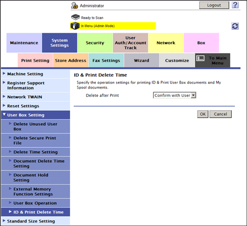 [Delete after Print] | Select whether to always delete files in the ID & Print User Box without checking with the user if they are to be deleted after printing them. [Confirm with User] is specified by default. |