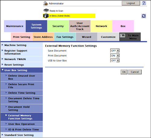 [USB to User Box] | Select whether to enable to save files from a USB memory into a User Box. [OFF] is specified by default. |