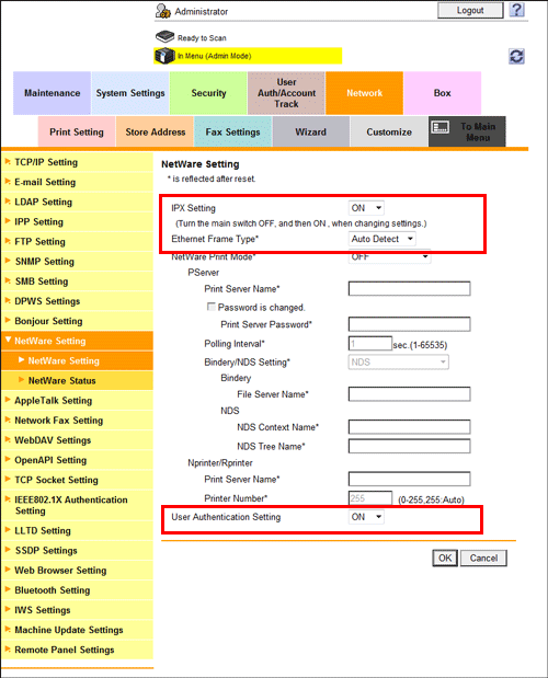 In the administrator mode, select [Network] - [NetWare Setting] - [NetWare Setting], then