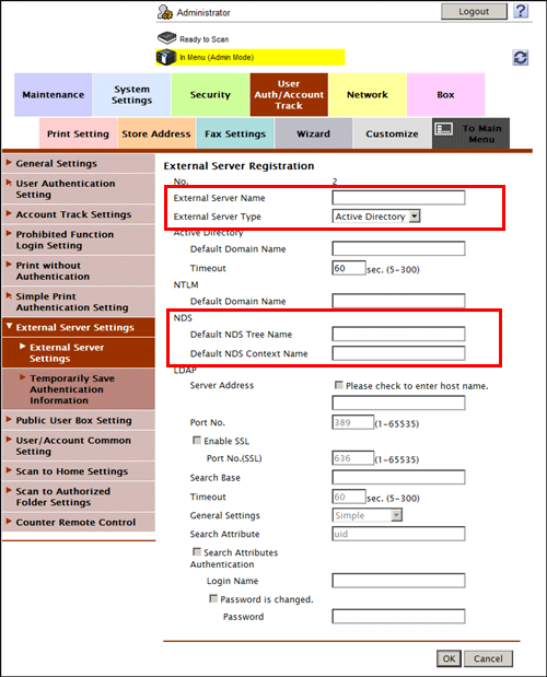 In the administrator mode, select [User Auth/Account Track] - [External Server Settings] -