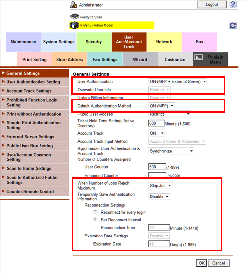 In the administrator mode, select [User Auth/Account Track] - [General Settings], then