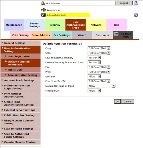 In the administrator mode, select [User Auth/Account Track] - [User Authentication Setting] - [Default Function Permission], then configure the default function permission setting when using an external authentication server.