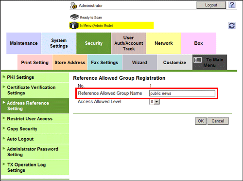 In the administrator mode, select [Security] - [Address Reference Setting] - [Edit], and enter the group name into [Reference Allowed Group Name] (using up to 24 characters) to register the reference-allowed group.