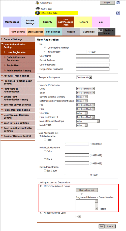 In the administrator mode, select [User Auth/Account Track] - [User Authentication Setting] - [User Registration] - [Edit], then select the [Reference Allowed Group] check box and assign a reference allowed group to the registered user.
