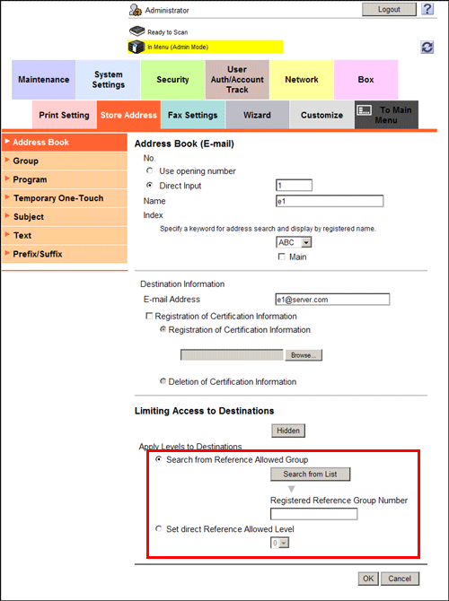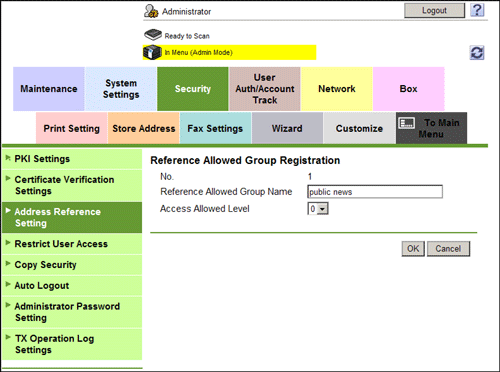 In the administrator mode, select [Security] - [Address Reference Setting] - [Edit], then register a reference allowed group.