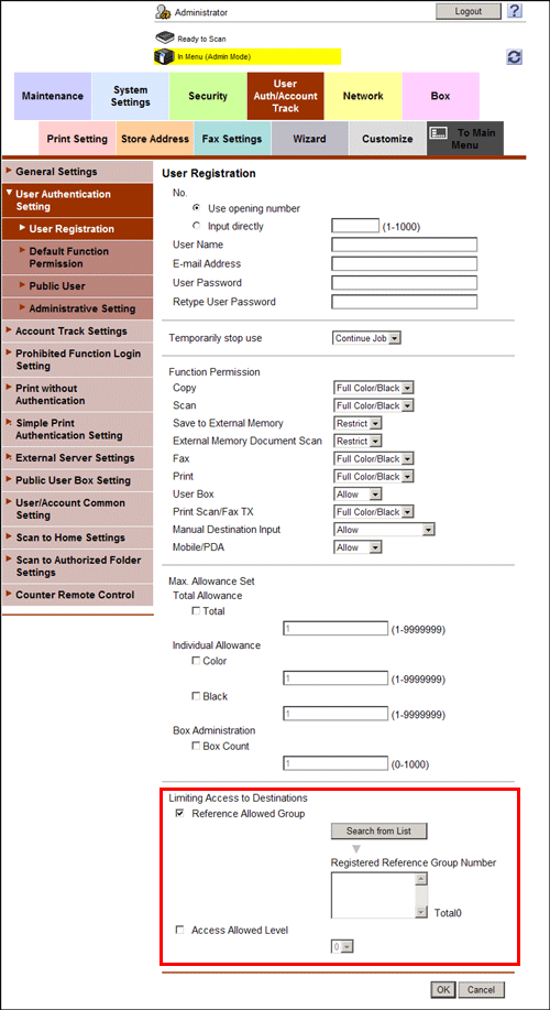 In the administrator mode, select [User Auth/Account Track] - [User Authentication Setting] - [User Registration] - [Edit], then set a reference allowed group and access allowed level for the registered user.