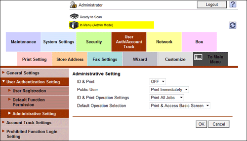 In the administrator mode, select [User Auth/Account Track] - [User Authentication Setting] - [Administrative Settings].