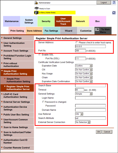 In the administrator mode, select [User Auth/Account Track] - [Simple Print Authentication Setting] - [Register Simple Print Authentication Server] - [Edit], then configure the following settings.