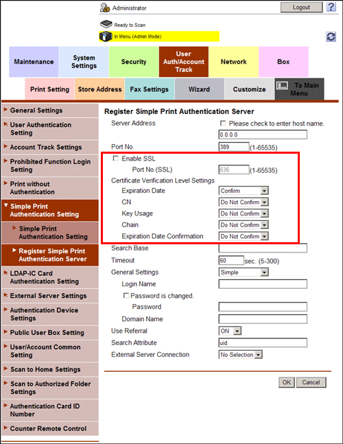 [Port No.] | If necessary, change the LDAP server port number. Normally, you can use the original port number. [389] is specified by default. |