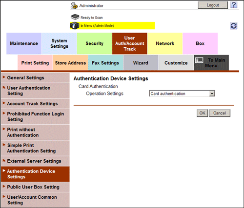 In the administrator mode, select [User Auth/Account Track] - [Authentication Device Settings], and then select how to log in to this machine (Default: [Card authentication]).
