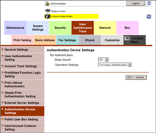 In the administrator mode, select [User Auth/Account Track] - [Authentication Device Settings], then set the operation of the bio authentication unit and how to log in to this machine.